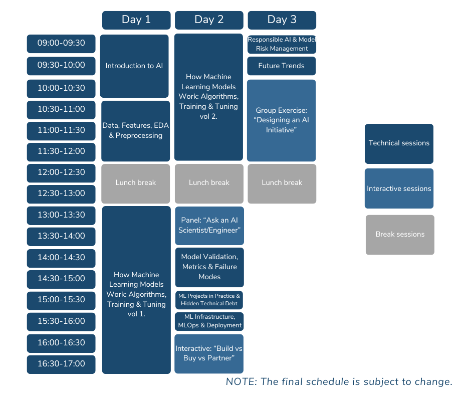 The Executive AI Bootcamp is an intensive 2.5-day program designed for business participants that are ready to turn AI from a buzzword into a strategic advantage. Through 11 focused sessions, participants gain a clear, technical understanding of how modern AI systems operate, how machine learning models are built and validated, and what differentiates successful AI initiatives from costly failures. The program takes a bottom-up approach, showing how foundational technical decisions drive business outcomes.